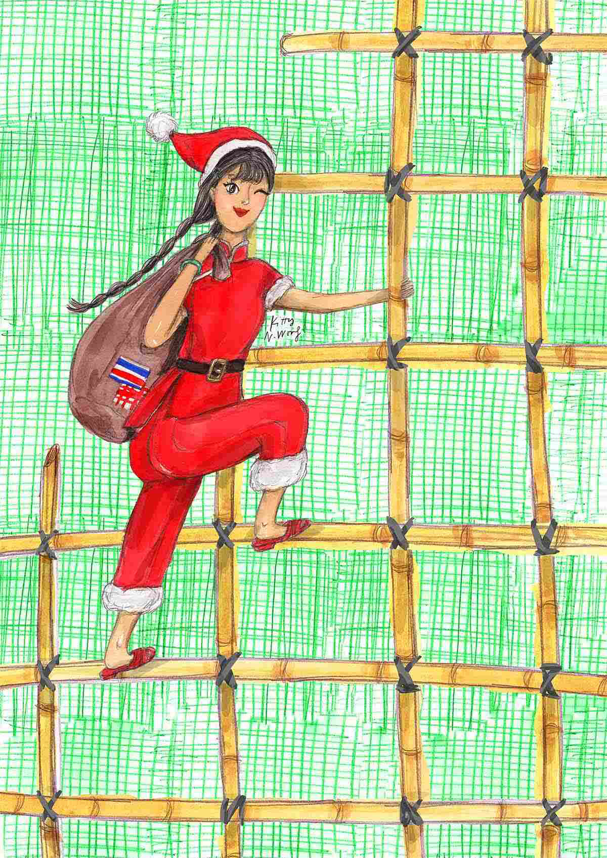 With her signature braided ponytail but dressed in a Santa inspired outfit, she scales the bamboo wall with a sack full of toys - perhaps for the children she cares for in her daily life.