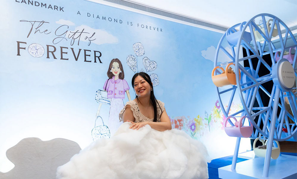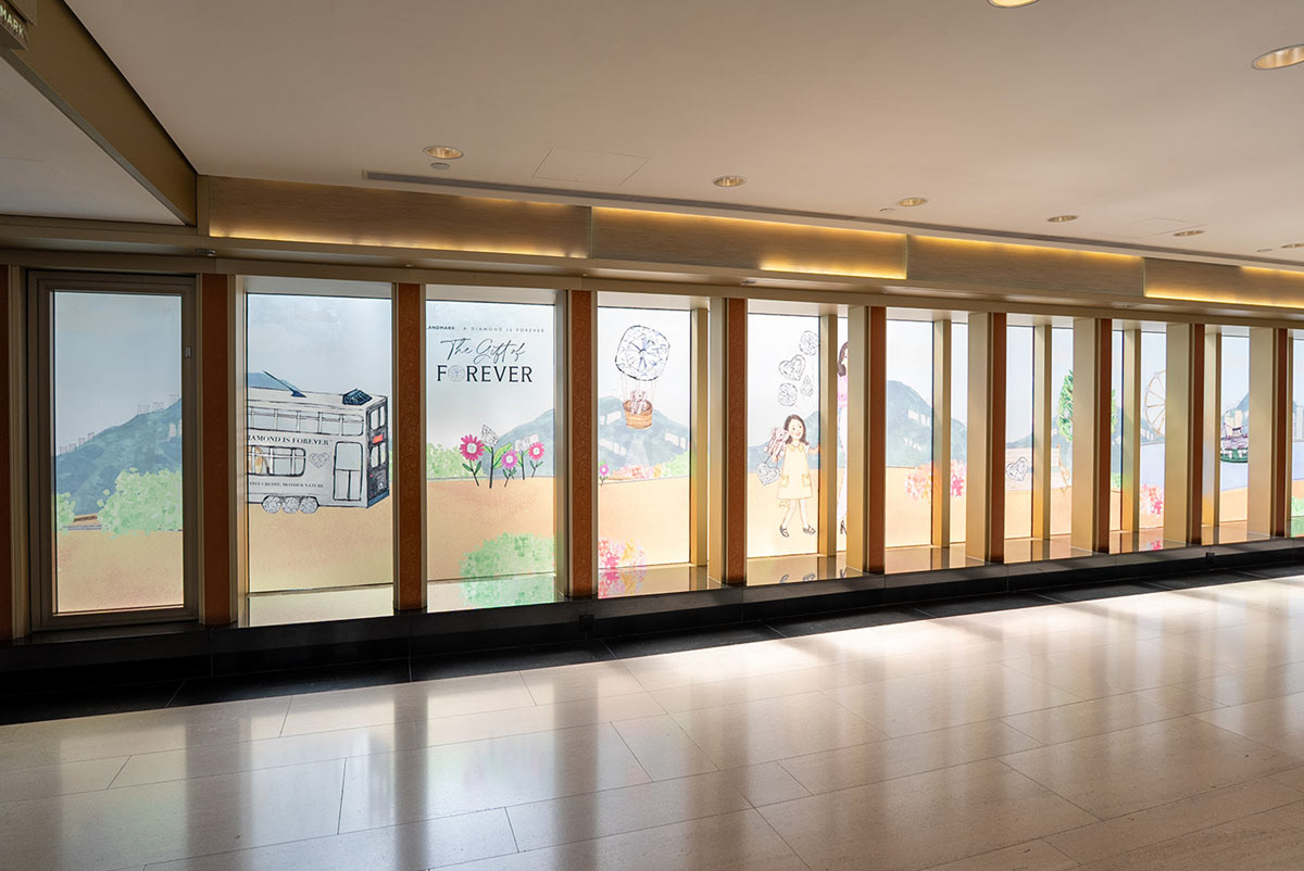 For the activation "The Gift of Forever" Kitty created artworks a series of artworks for De Beers that were used in mural and various installations in public spaces across LANDMARK, including Chater House, Alexandra House. Transformed into an artistic haven, showcasing interactive installations crafted by Hong Kong-based artist Kitty Wong.