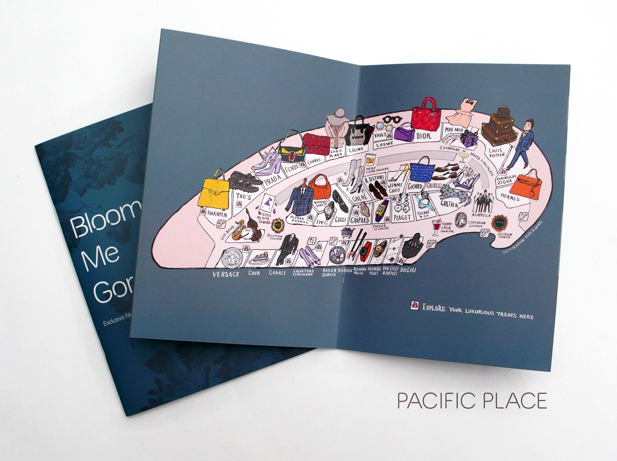 Illustration and map design for Hong Kong Luxury Shopping Mall Pacific Place's "Bloom Me Gorgeous" event. The fashion figures illustrations were used for the flower art workshop with floral artist Gemma Hayden Blest during the event.